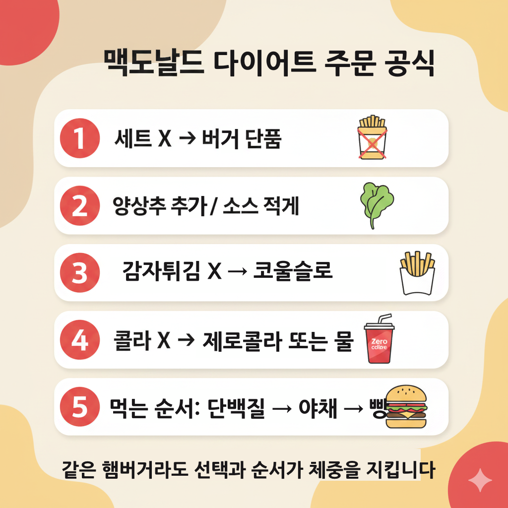 맥도날드는 단품 + 0칼로리 음료 + 감자튀김 대체 + 먹는 순서만 지키면 체중이 크게 흔들리지 않습니다.