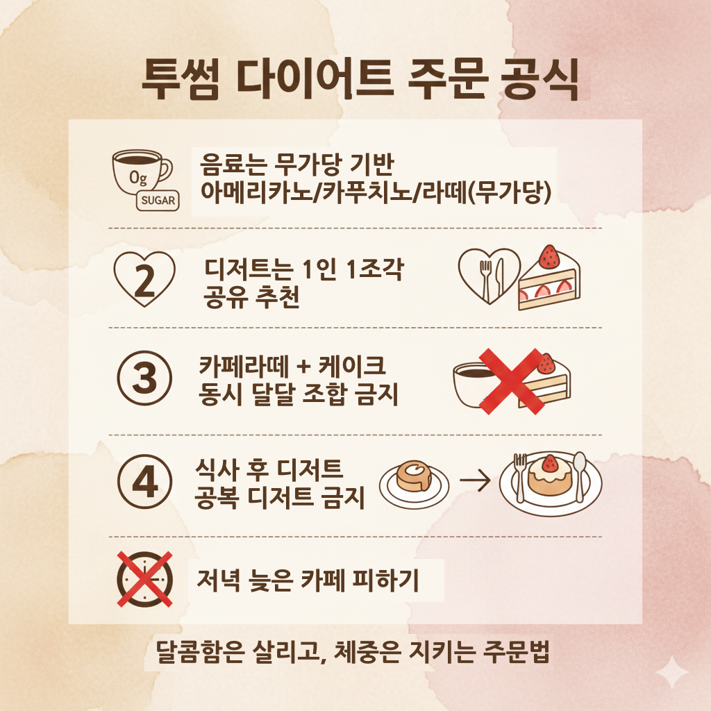 투썸에서는 음료 선택 + 디저트 1인분 기준 + 먹는 순서 + 타이밍만 바꾸면 달달한 걸 먹어도 체중이 크게 흔들리지 않습니다.