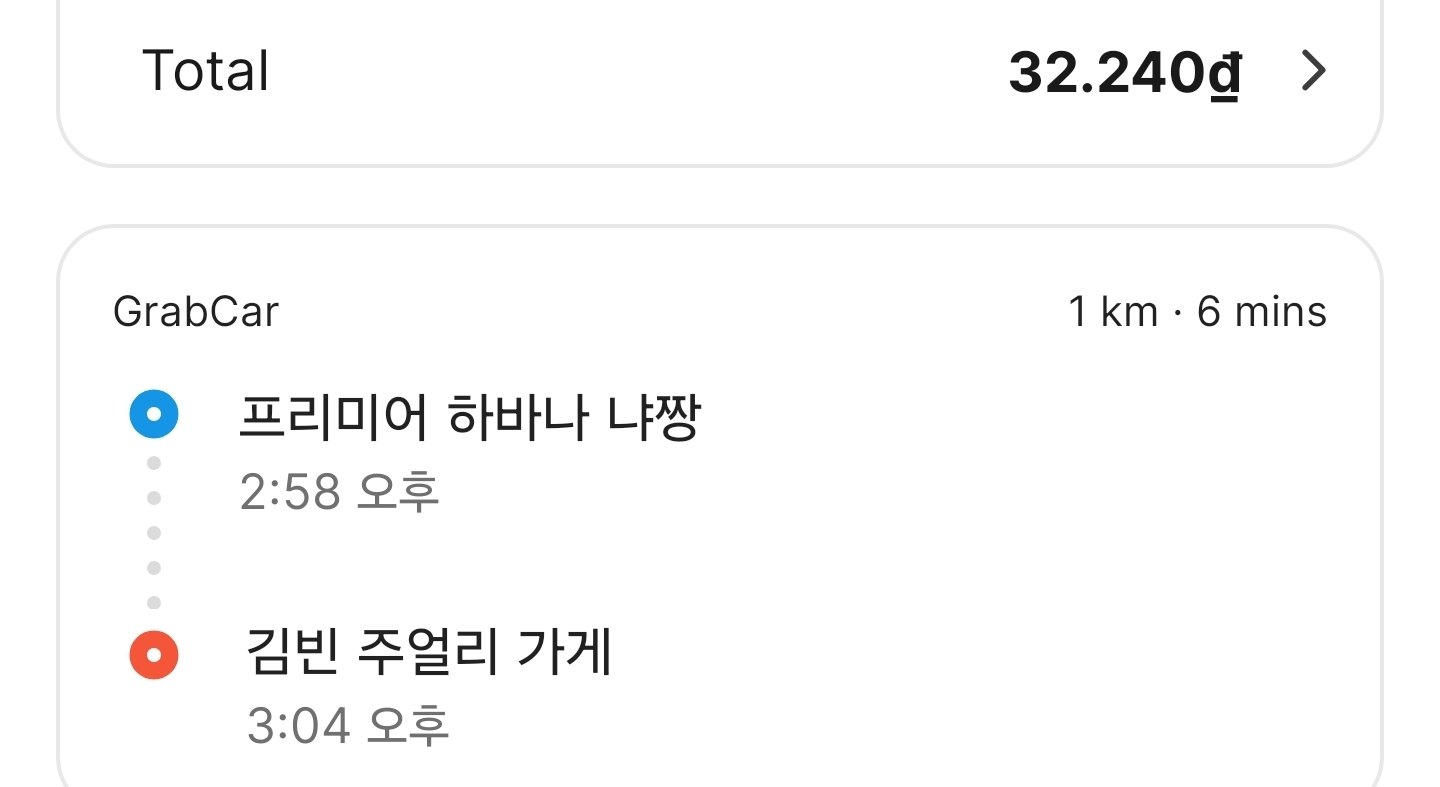 | 롯데마트 골드 코스트 → 목식당 | 1km | 6분 | 32,240₫ | 약 1,700원 |