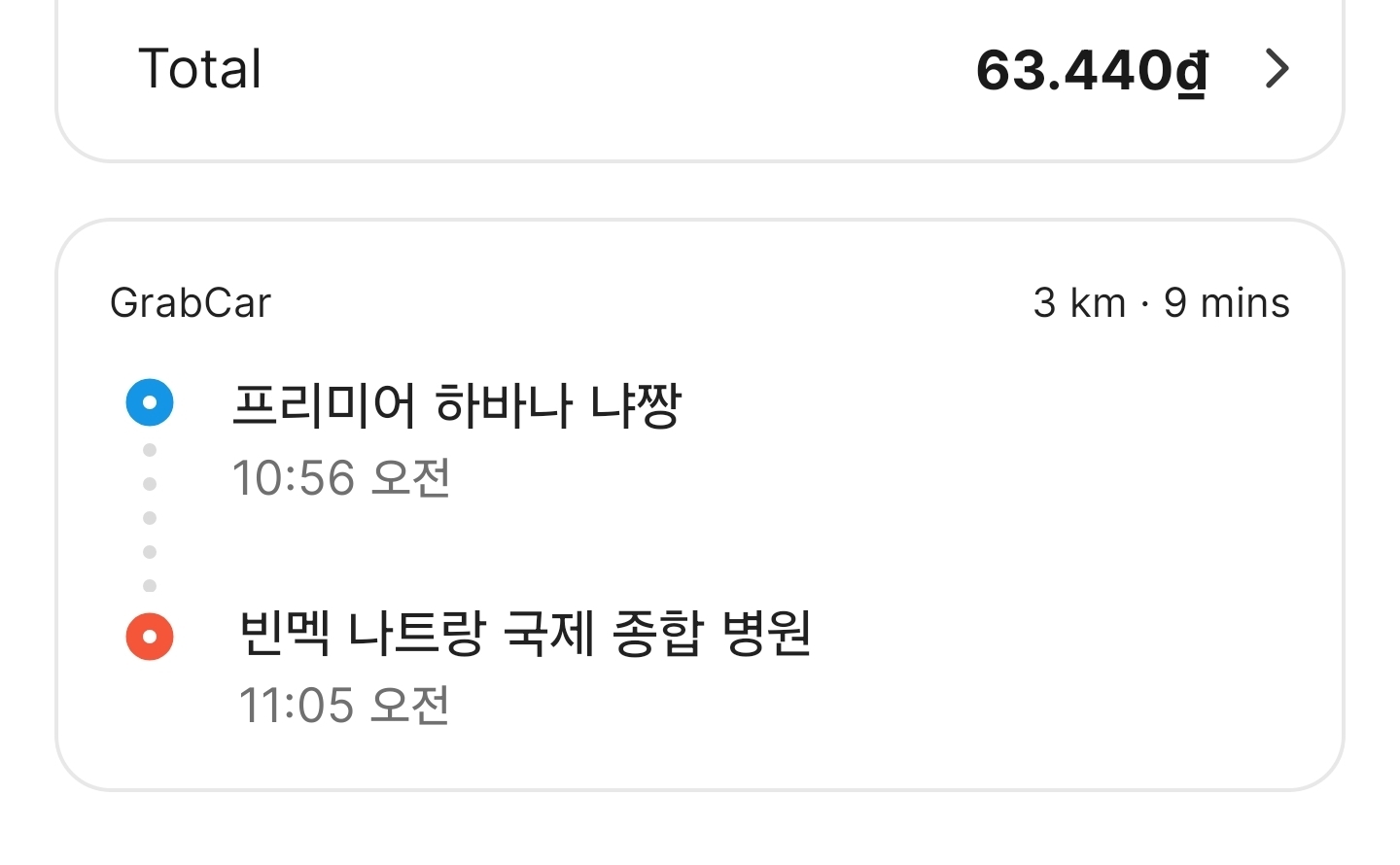 | 하바나 호텔 → 빈멕 국제 종합병원 | 3km | 9분 | 63,440₫ | 약 3,300원 |