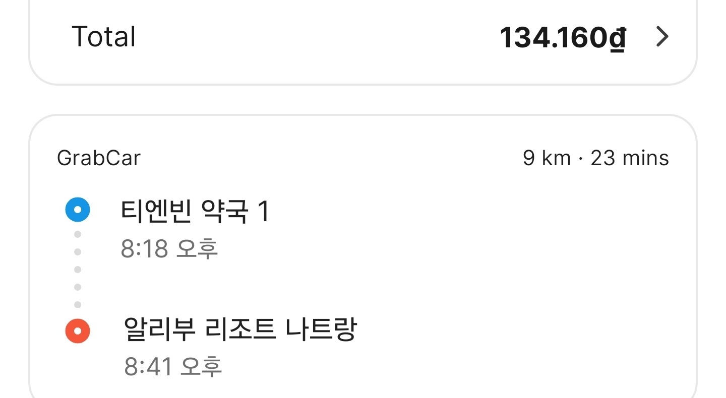 | 티엔빈 약국 → 알리부 리조트 | 9km | 23분 | 134,160₫ | 약 7,000원 |