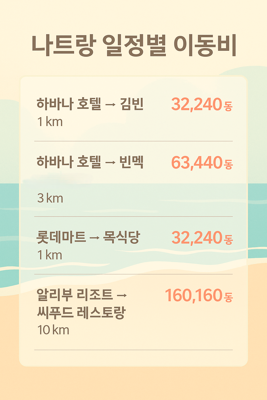 | 중심부 → 알리부 리조트 | 9km | 20분 | 151,840₫ | 약 8,000원 |